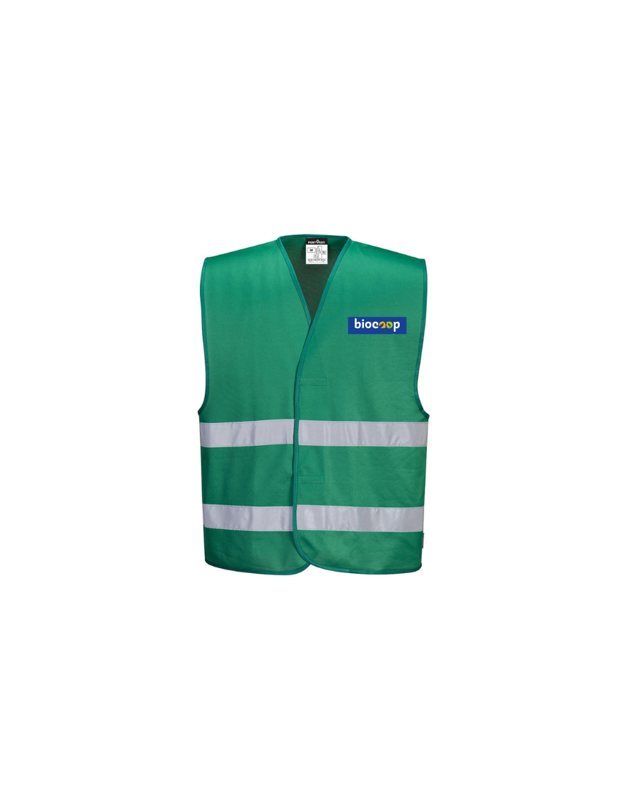 Gilet HV vert personnalisé avec le transfert cœur du logo BIOCOOP blanc sur fond bleu