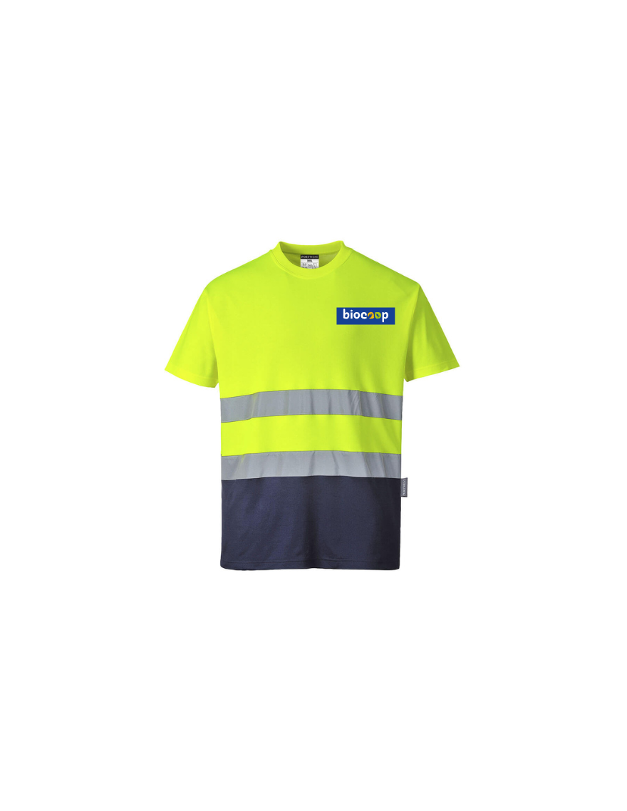 Tee-shirt jaune personnalisé avec le transfert coeur du logo BIOCOOP marine.